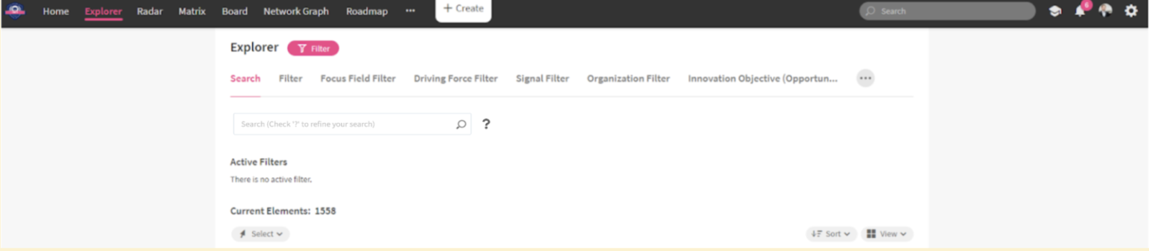 The most comprehensive search is available in the Explorer. The Explorer is the heart of the ITONICS application as it lists all the content that is stored on the application. Thus, it will allow you to search for content across different categories, and it will also allow you to filter the content by defined values.