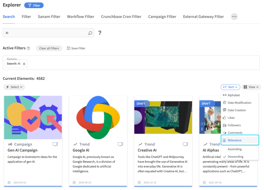 Also, be aware that performing a search for the same search term in the global search bar and then clicking on “View all Elements” will redirect to the Explorer with the Relevance sorting already applied, to ensure that the search results do match.