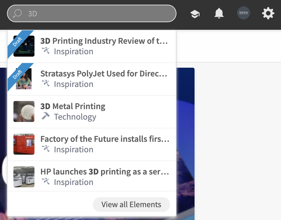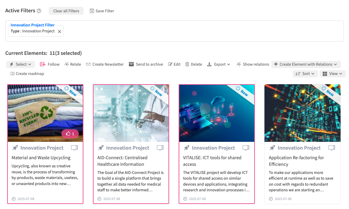 A key aspect of the ITONICS application is finding the right content pieces. As it serves as your internal intelligence system for everything innovation, you need to know how to best detect the content you are looking for. After finding the right content pieces, you can either process them individually (by liking, viewing, commenting, and alike) or as a bulk.