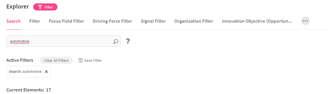 The ITONICS Innovation OS provides you with two options to search for elements and multiple options to slice and dice the content database by applying filters: