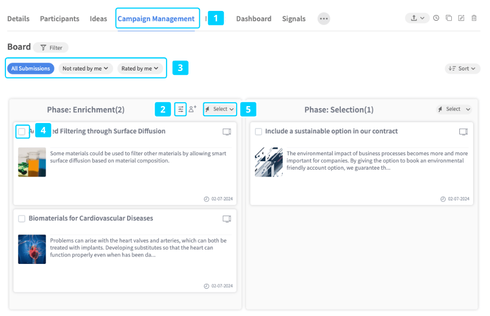 On each Board column, you find a Bulk Rate icon (2). The columns represent the campaign phases. The quick filters will help you to filter for your Not rated by me and already Rated by me Elements per phase (3). Please note you only see the icon if you are assigned as an evaluator in that phase. Use the checkbox icon on each element card (4) to specifically select submission elements to perform bulk rate on, or use the Select option (5) to easily Select all element cards within a column to perform a bulk action on.