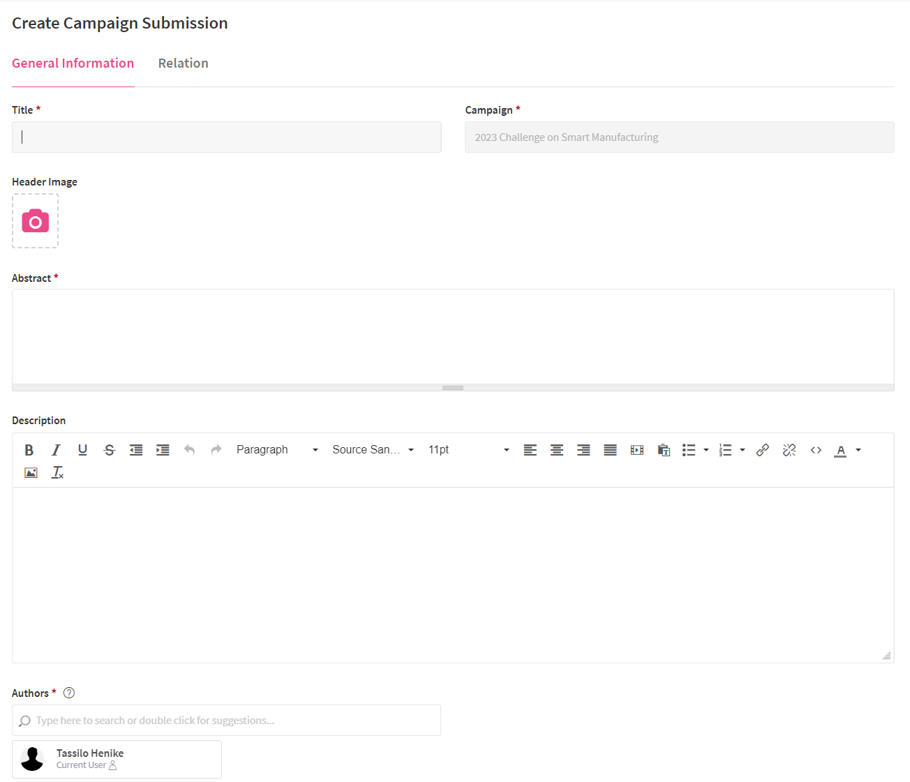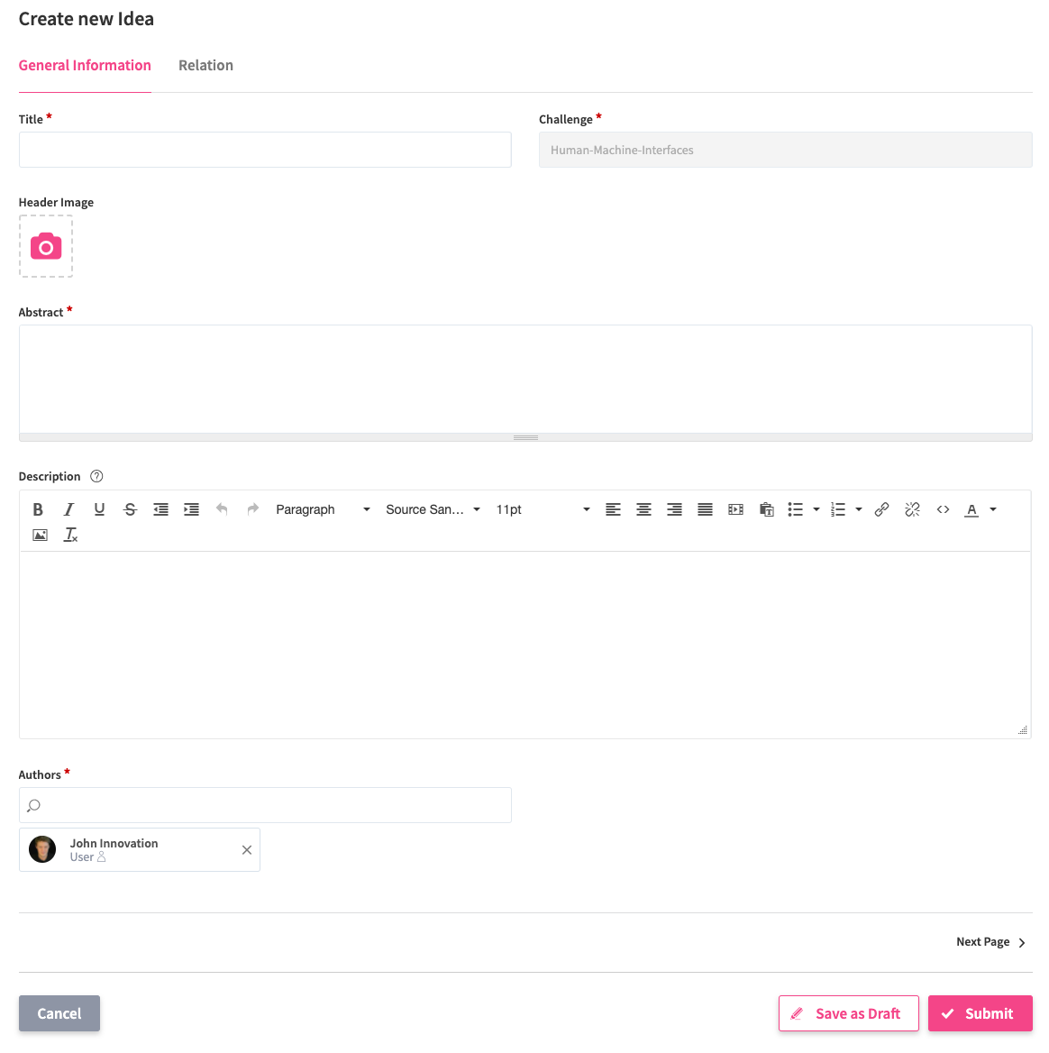 After accessing the detail page of the campaign, you will find the submit button under the campaign title and abstract if the campaign still allows submissions. Click on the submit button and fill in the form that has been provided by the campaign manager. Open the Relation tab to relate any necessary elements to contextualize your idea. This helps evaluators to better understand and sense the context and intention of your idea. Click either Save as Draft (in case you want to fine-tune your Idea first) or Submit your Idea straight away.