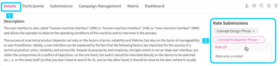 For the second option, navigate to the Campaign Details Page tab. (1) In the sidebar, you find action buttons that give you access to your Rate all Elements and Rated only unrated Elements per phase (2). Please note you only see the icon if you are assigned as an evaluator in that phase.