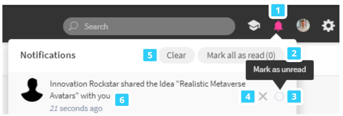 - To mark a single notification as read, click the circle icon next to it while hovering. (3)