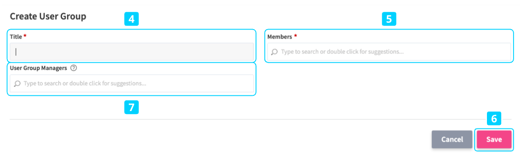 You can add a new User Group by clicking on the +Add User Group button. Choose a title (4), search and add members (5), and save the User Group (6).