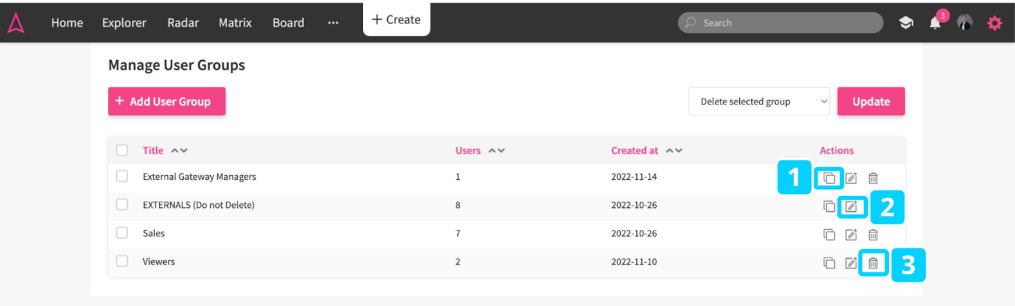 A User Group is a set of people that share interests, goals, or responsibilities in the ITONICS system. By defining User Groups, you can easily collaborate with your colleagues by sharing an element or inviting them to an innovation project.