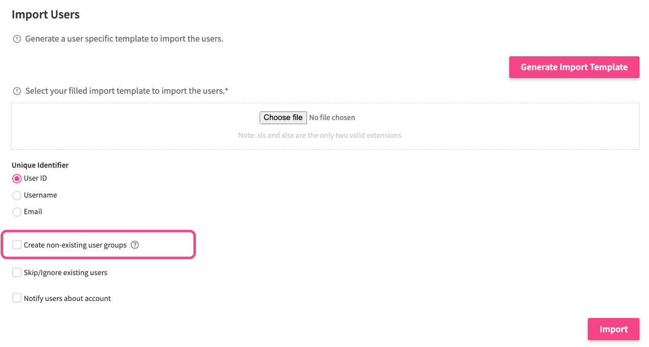 Via the xls User Import interface, you have the option to bulk assign and create User Groups. If you want to create new User Groups, you can mention these groups in the template and assign the respective users to those groups. Use a comma to separate different groups, and the User Group will be created during the import. In this case, check the box to Create non-existing user groups.
