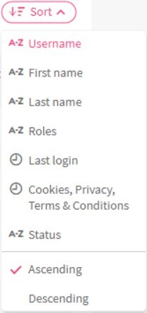 The user overview can be sorted both ascending and descending via the Sort dropdown. By clicking the button you can sort by Username, First name, Last name, Roles, Last login, Cookies/Privacy/Terms & Conditions, and Status.