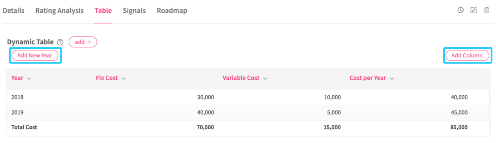 Column Button? (only for Dynamic Tables) - Check this box when creating/editing a table to allow users to dynamically add new columns in the overview page of an element via the Add button.