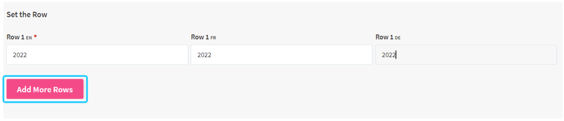 If the type of table is a Normal Table or Dynamic Table, new rows and columns can be added or removed via the respective Add More Rows/Columns and Remove Row/Column buttons in the table configuration. For Dynamic Tables, adding rows or columns is also possible via the respective buttons on the overview page of an element.