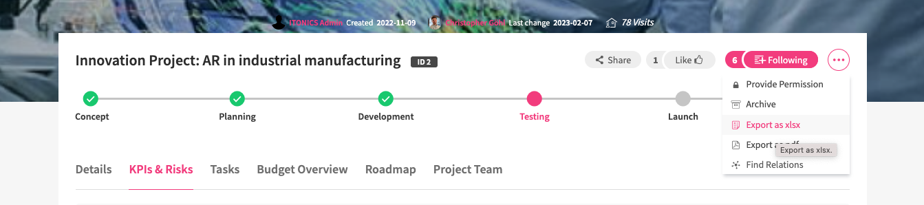 To export the data, you can trigger the export directly on the element that contains a table. The export file (.xlsx) contains several sheets, including one sheet for the table data.