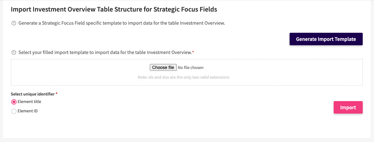 You will be taken to the import mask for the table data for the selected entity. You can "Generate Import Template" which will provide you with a file that you can use to import your data. Once you have added your data to the file, you can select the file and upload it to the platform. Make sure you enter the correct element mapping to ensure you load the table data into the correct element.