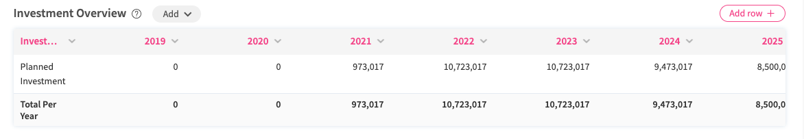 Since the import is done in an additive way, you can only overwrite/update the data in a row when you enter the identifying value, e.g., the value placed in a cell of the first row (Planned Investment). If you were to upload a completely empty table (only including the table heads but not further values), this would not overwrite the table data. Cleaning all table values, i.e., the values in the following columns, only works if you enter the identifying value and leave all other cells in that row empty.