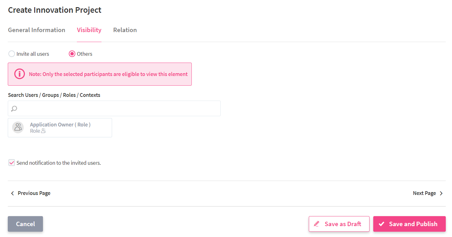 Select Other if you want to restrict the visibility of this element. Now only the Application Owner and those added via the search field Search Users/Groups/Roles/Contexts can see the item. You can add single users and user groups, roles, and contexts (often: Business Units).