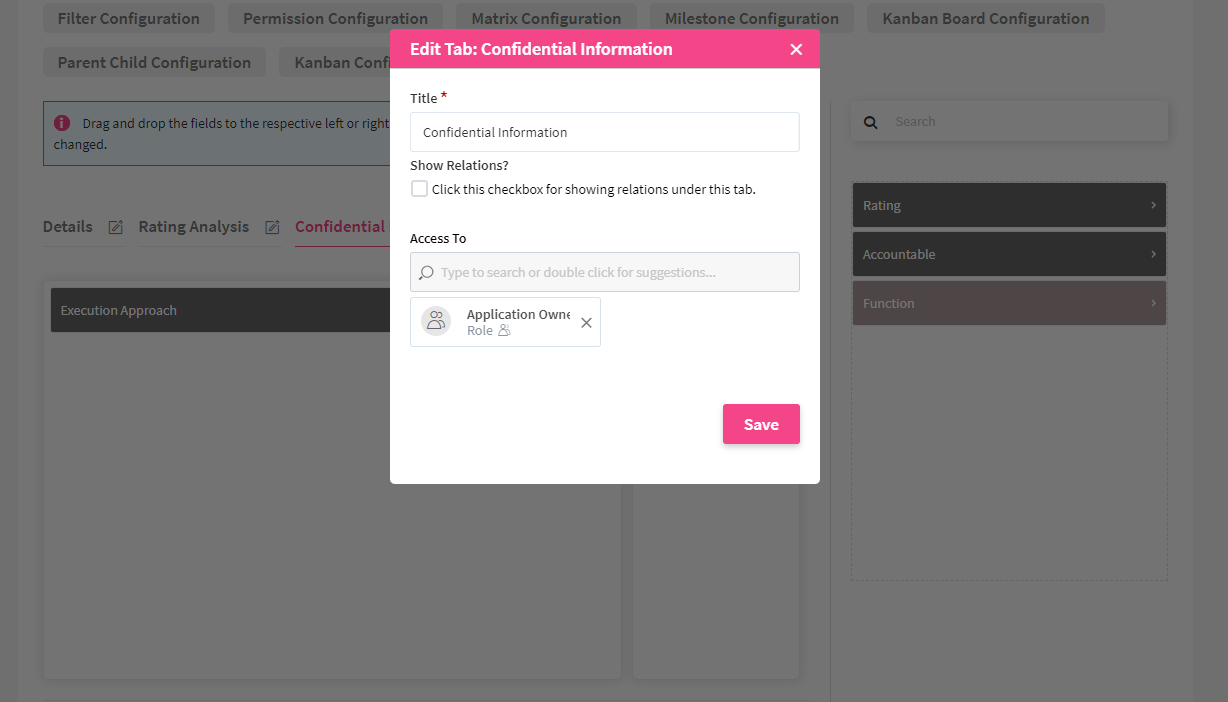 If you now want to restrict access to a tab, find the "Access To" search field when you click the pen icon of the respective tab. Name the user/user roles/groups to whom you want to give access to this tab. If no user is selected, all users who have the respective Create/Edit/View permission can view this tab.