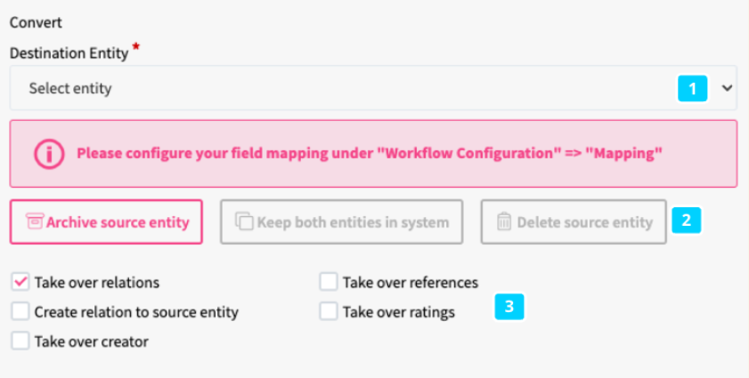 Note: Convert Entity can be combined with Phase Change, Workflow status change, Value Change, Comment, Notification, Rating, Date Value Change. However, Convert Entity cannot be combined only with Enrichment trigger type.