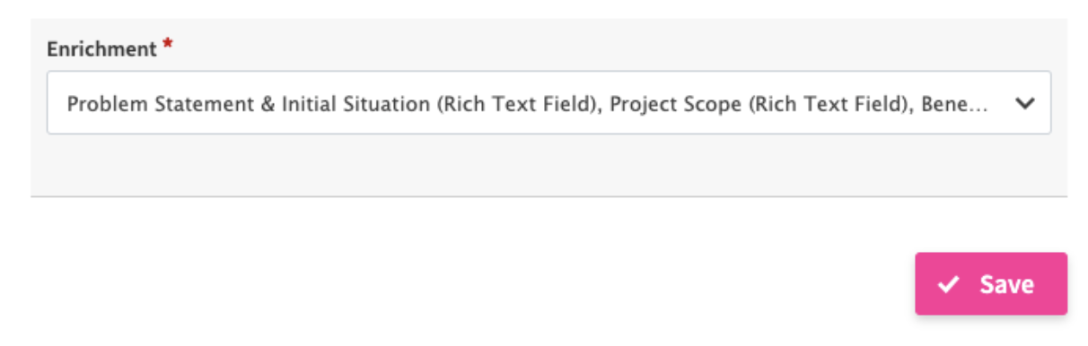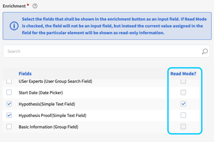 Besides the general Enrichment use case, there is the use case of providing further guidance to users when enriching values. An example could be a workflow in which users are required to input a value in a hypothesis field in a phase 1, which will then be the basis for decision on further enrichment in the next workflow phase 2 . In this case, the user should only see the value of the hypothesis field provided in phase 1, but not be able to overwrite the value again. Thus, simply adding the field in the enrichment form doesn’t work, since the user would be prompted to provide a new value for the same field. Instead, you can make use of the Read Mode feature when selecting fields for Enrichment (see screenshot above). First, on the left of the field list the fields to be added to the enrichment button must be selected. Then, optionally on the right side, the Read Mode option can be checked for a field to add the field with its currently assigned value for a particular field in the enrichment form in read-only mode, meaning it cannot be edited / overwritten.