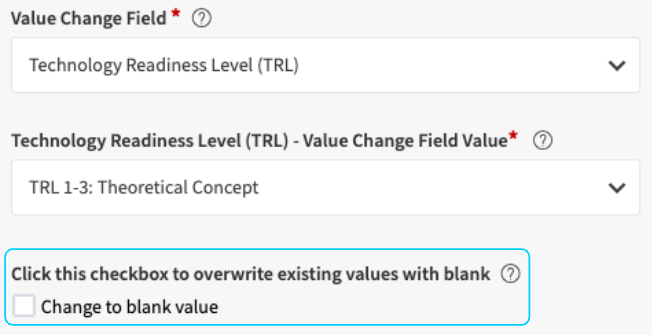 Further, if a non-mandatory field is selected as the Value Change target field, then optionally the config option to change the value to blank will be available. If enabled, on triggering the action button any field value assigned to the particular Value change target field will be removed and overwritten with blank.