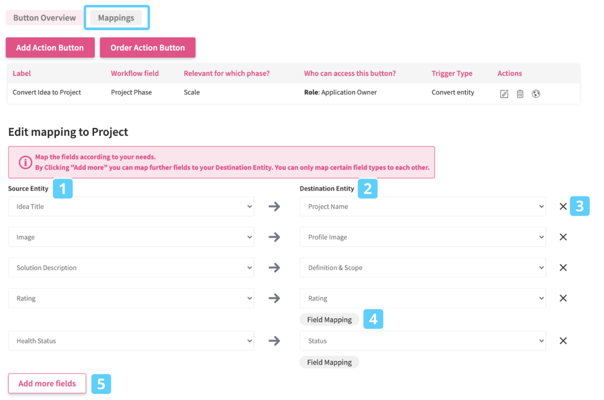 - Select the fields from the Source Entity (1) and map them to the matching ones in the Destination Entity (2)