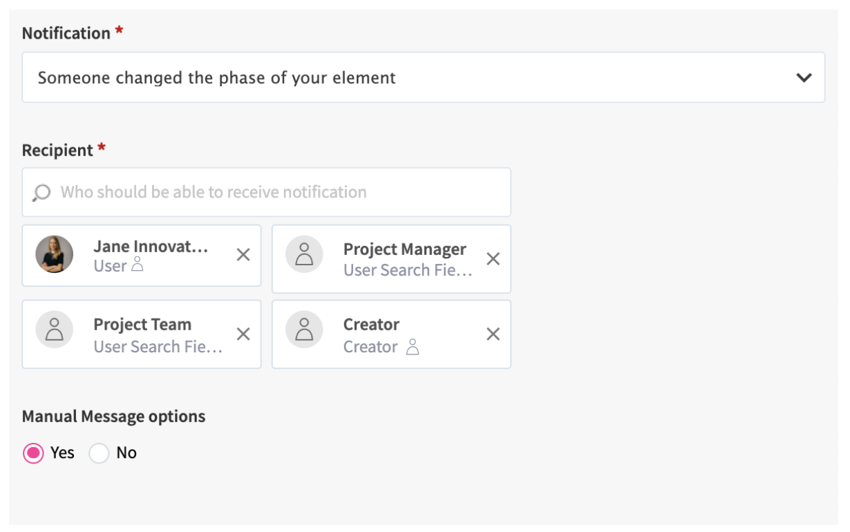 Note: it is possible to select the currently logged-in user as a recipient, who would receive a notification if the notification trigger is triggered by a user other than herself/himself (e.g. to check notifications being received when triggering the button).