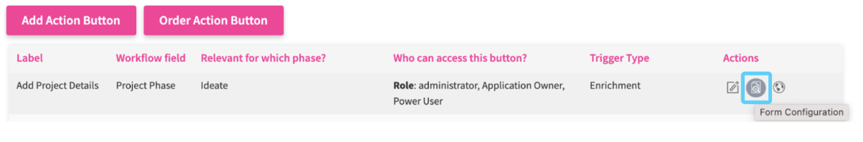 To specify how the fields that you just selected should be displayed and placed in the pop-up window (Form), click Save in the Button Configuration. In the overview of all configured action buttons, locate the Enrichment button (in this case Add Project Details) that you just created and click the Form Configuration action icon.