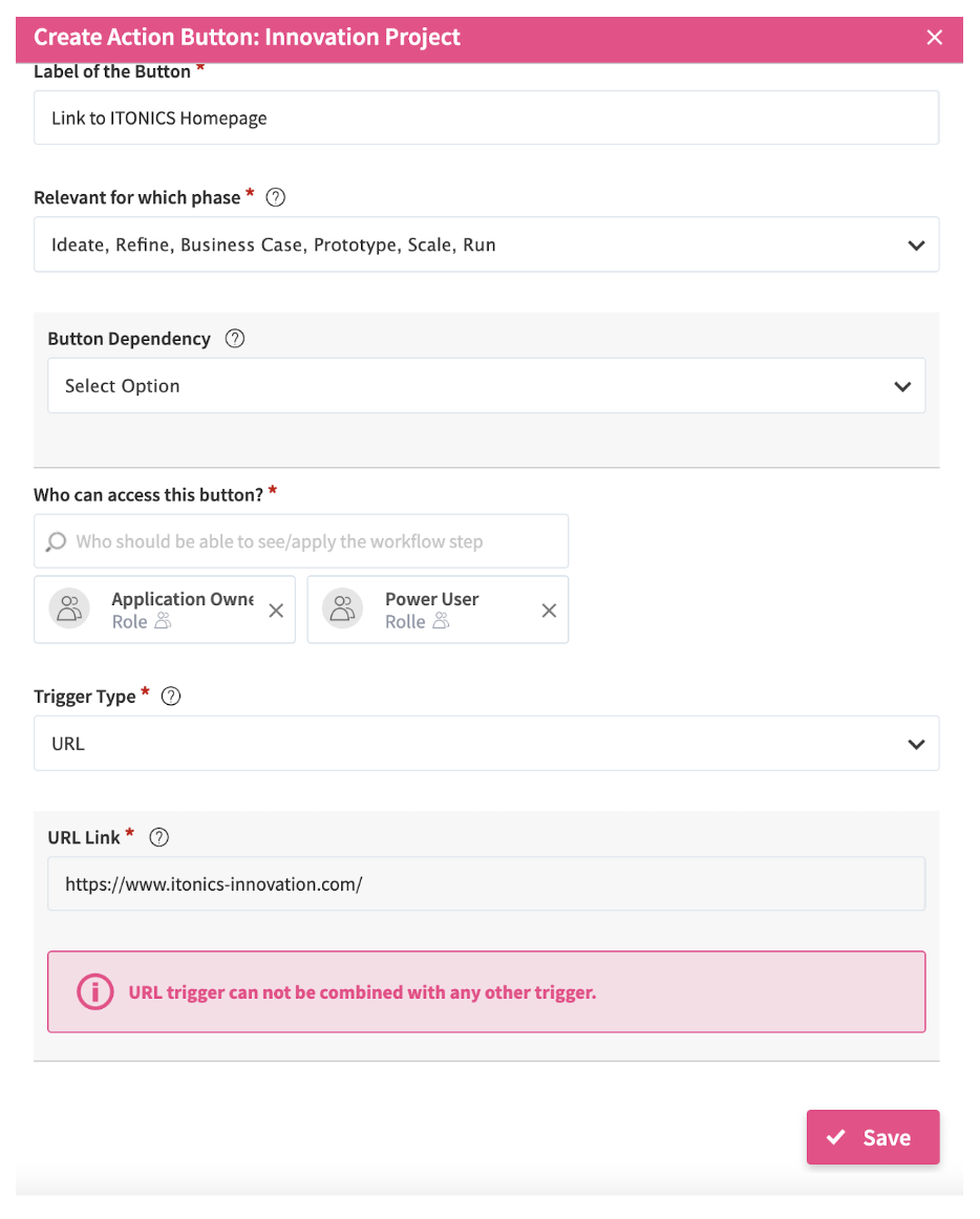You can use the URL trigger link to any external or internal website. This trigger enables you to link for example to a SharePoint site, blogs, a specific Knowledge Base article or within ITONICS to a specific site, for example to a custom tab with KPIs or the Radar.