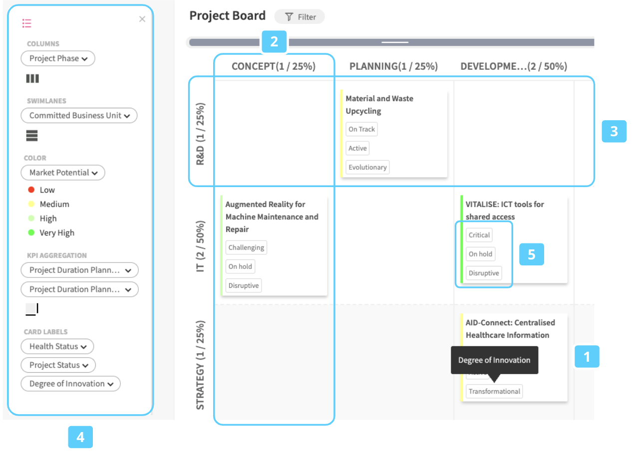 Besides, you have the option to define up to three Dynamic Card Labels (5) to be displayed on the element cards to provide additional information for each Innovation Project (the default field for each can be set in the Kanban Board configuration, while the fields can always be adjusted dynamically). In this example, the Health Status, Project Status, and Degree of Innovation of each project is displayed. Note that if no value is provided for a dynamic label for a respective element, then no value will be shown on the element card. Further, if the respective user does not have the visibility to see a field within a confidential tab, then this value will also not be visible on the element card.