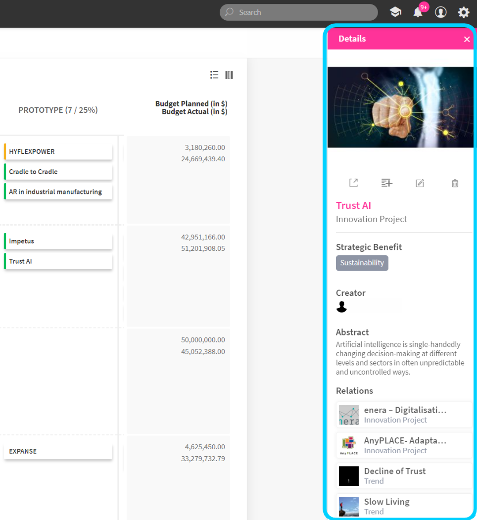 If you click a card inside the Board, a preview of that Element opens on the right. Here you can see an overview of the basic information such as the Title, Abstract and the Relations of that Element. You can also find some quick actions to open, follow, rate, edit or delete the Element if you have the permissions to do so.