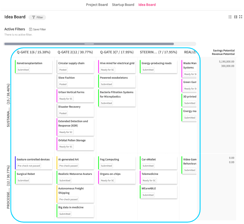 The ITONICS Board is the module for displaying a content landscape which follows a certain process flow. It can, for instance, help you understand in what stage and status your project portofolio is. It is organized by rows and columns whereas each can represent a specific meaning. Furthermore, the color displayed on the card of a content element can represent a third dimension. If you use financial KPIs on your content elements, they can be aggregrated here to reflect the overall status of your innovation portfolio.