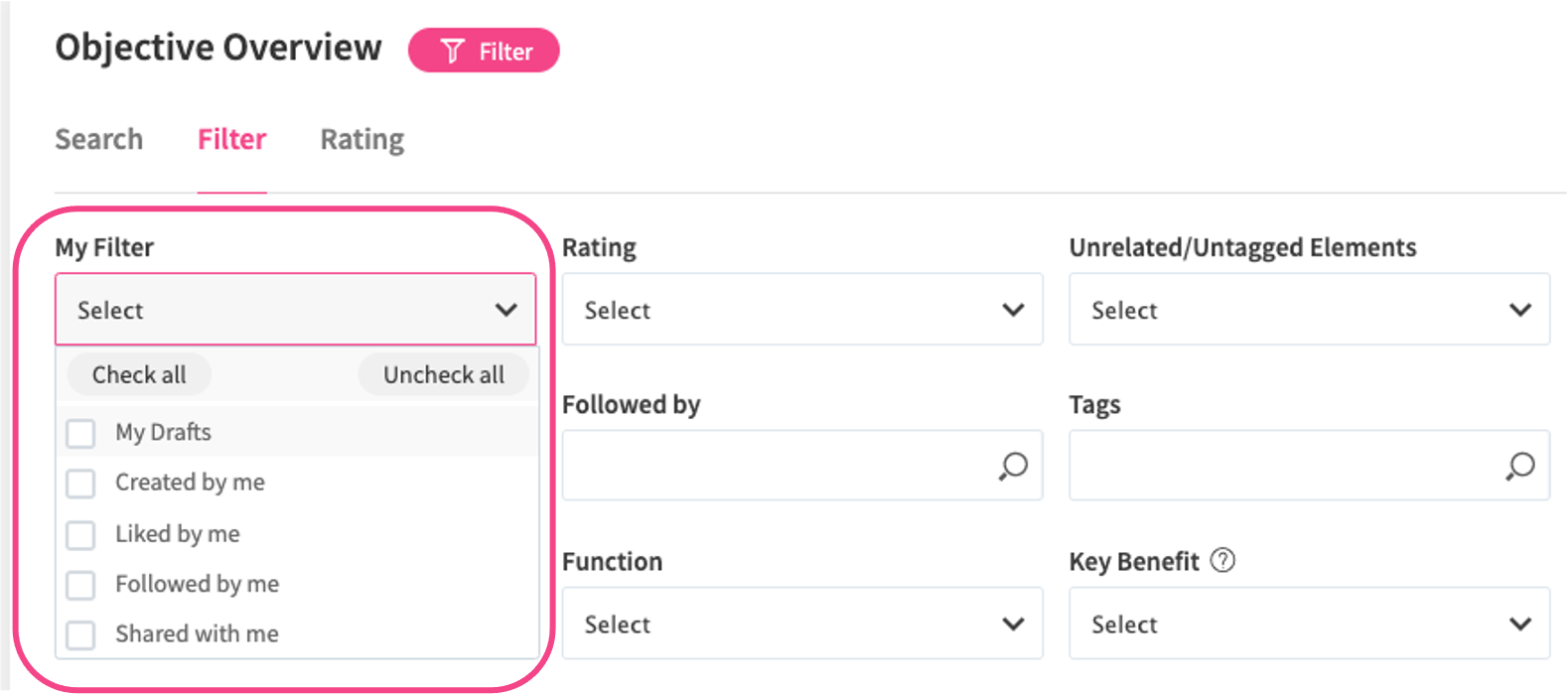 The content elements visible on the board are published content and own drafts (i.e., no archived or draft elements created by other users are shown ) and of one specific content category . To display only the content you liked, followed, shared or created you can use the filter settings under filter options and then My Filter.
