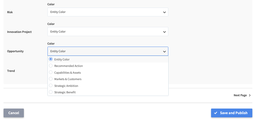 - Note that on reloading the page or navigating to another module, the colors controlling the respective entity types are reverted to the default color configuration defined for the particular roadmap.