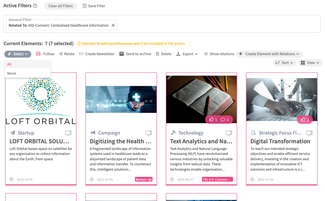 If enabled, navigate to the Explorer module. Either make use of the filter section to narrow down your elements and Select All, or make use of the cursor select option to select the elements that you intend to place on a roadmap.