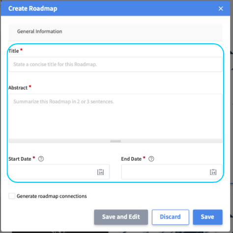 If clicked once, the General Information section will close. Within the modal, the familiar, mandatory field options Title and Abstract will be shown to define the basic information of the roadmap to be created. Besides, the Start Date and End Date fields are displayed. These are set to mandatory as the date information provided within those fields will in particular cases be used as a fallback option for determining start and end date positions of specific elements on the roadmap. Note: The underlying logic will be elaborated in more detail below.