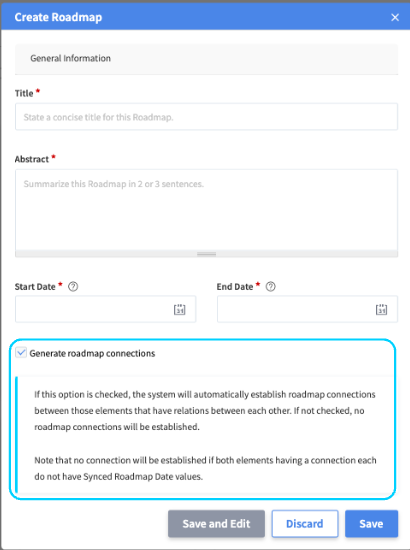 Once you have provided the mandatory roadmap information and have decided whether to automatically Generate roadmap connections, you may either click Save and Edit to save your roadmap, but be redirected to the Edit roadmap page, i.e. to define further information such as the default roadmap colors, Discard the creation action, or simply click Save to immediately save and create the roadmap and be redirected to the actual created roadmap view.