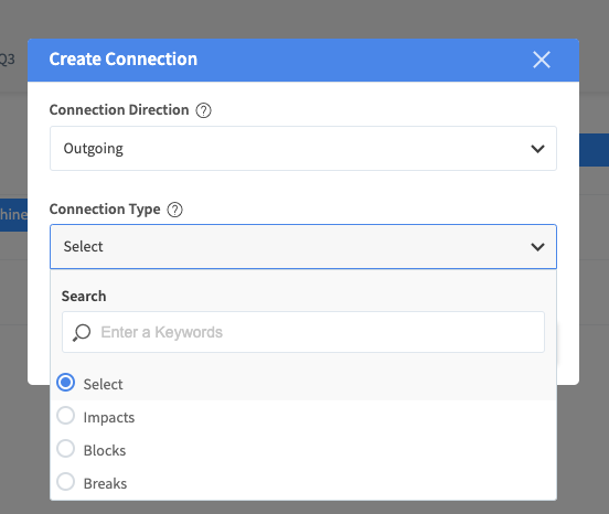 On the milestone bracket and preview, you will see the milestone type. It shows, for instance, "Approval". You need to select the type when creating a milestone. There are default options provided in the Milestone Type dropdown, however, your Application Owner might have also created his/her own milestone types . Now, you will see a couple of options for how to filter connections.