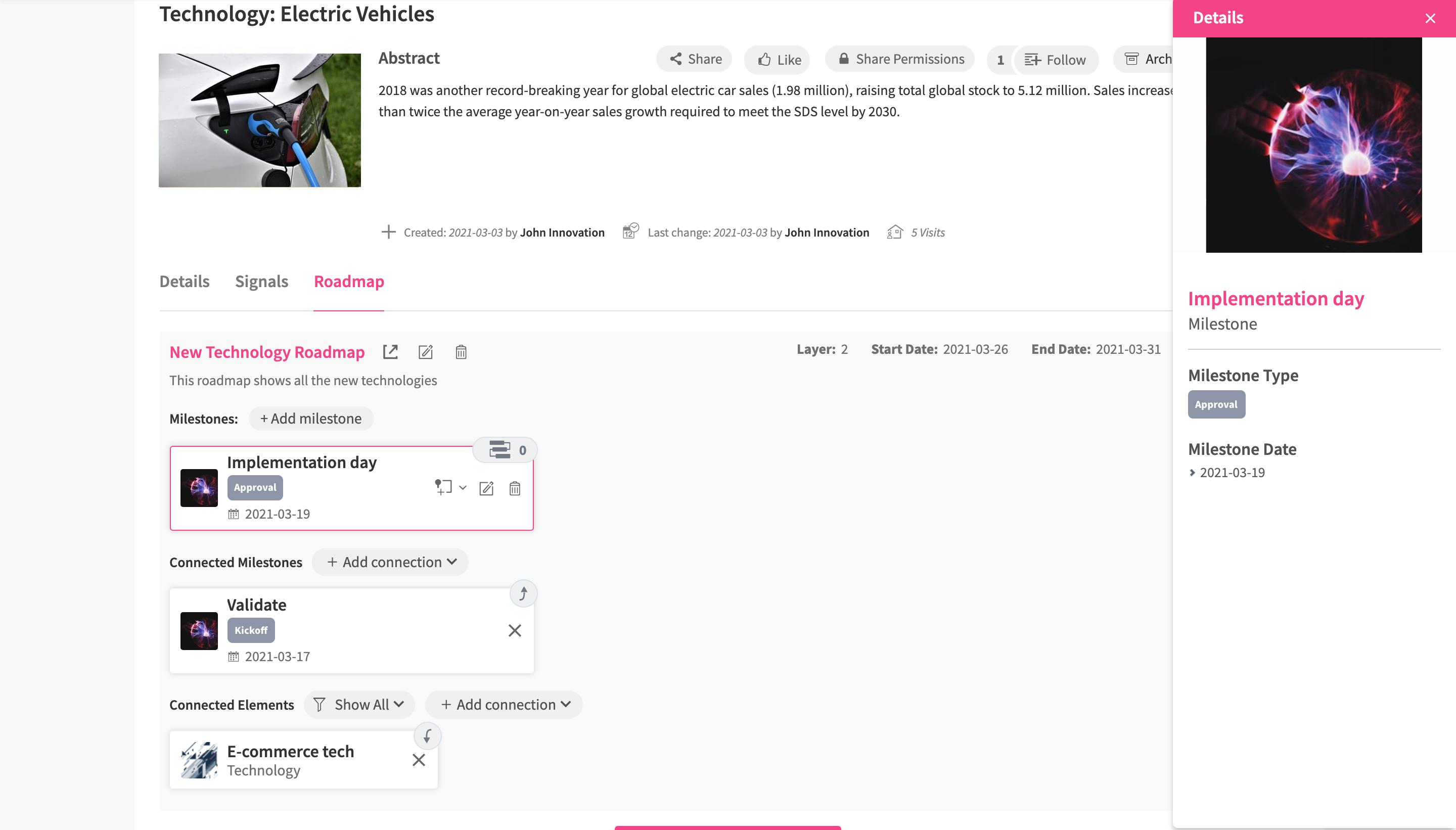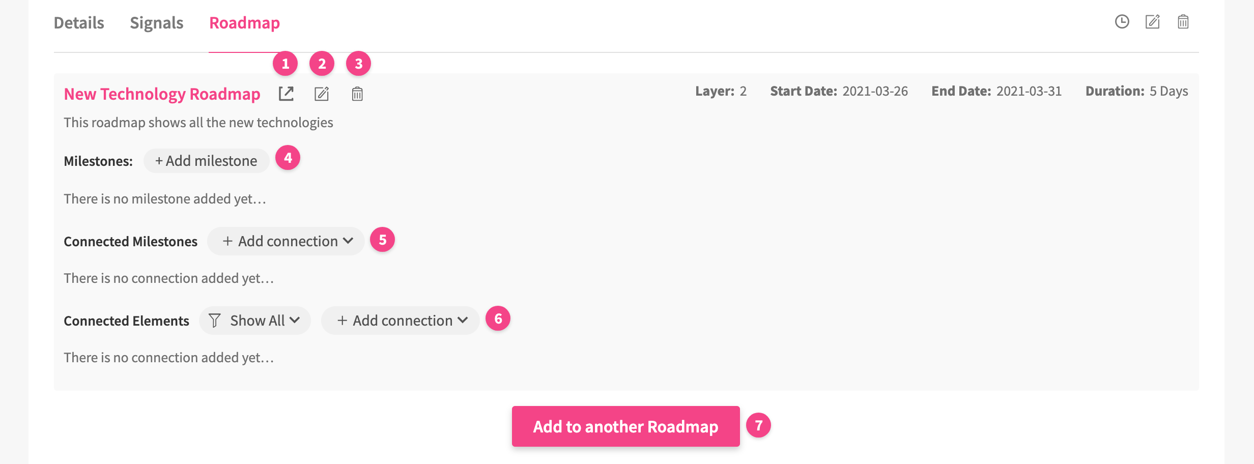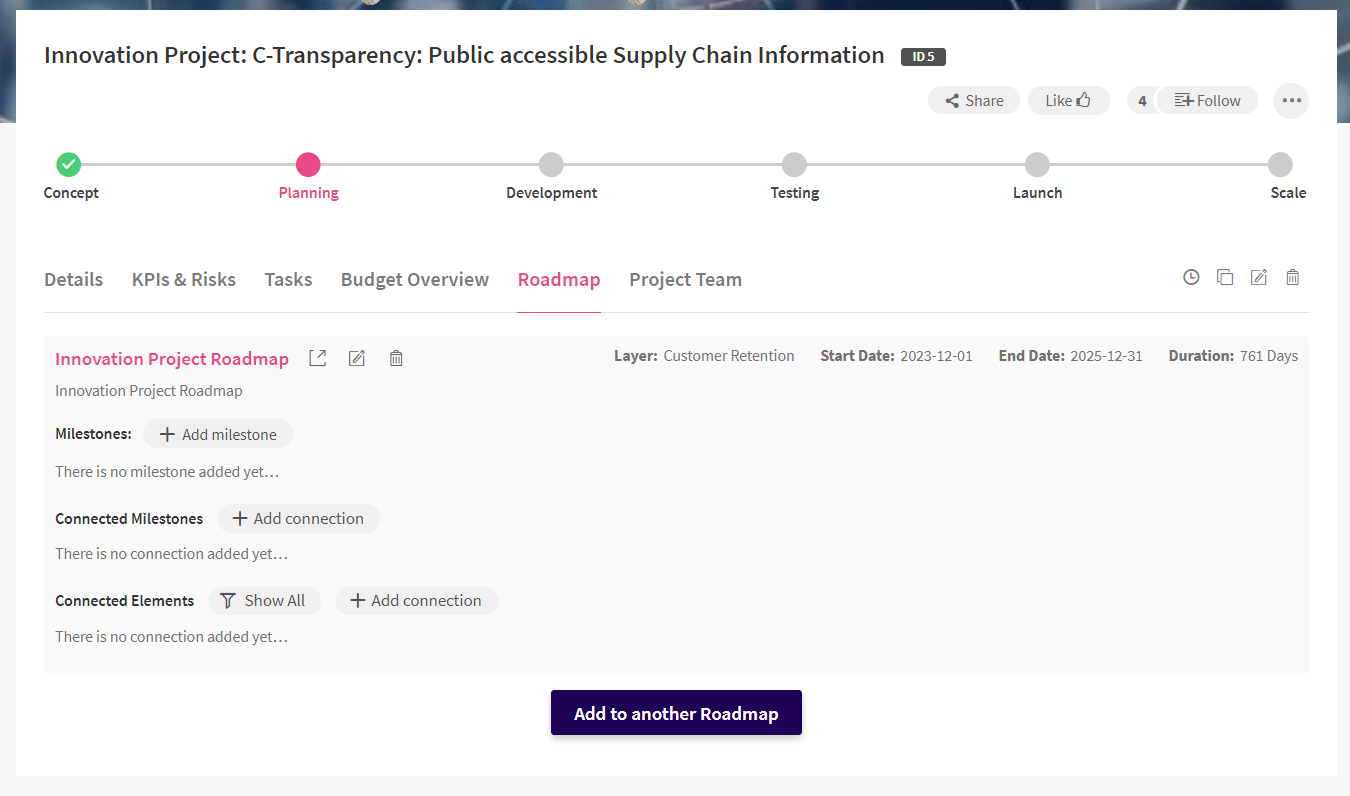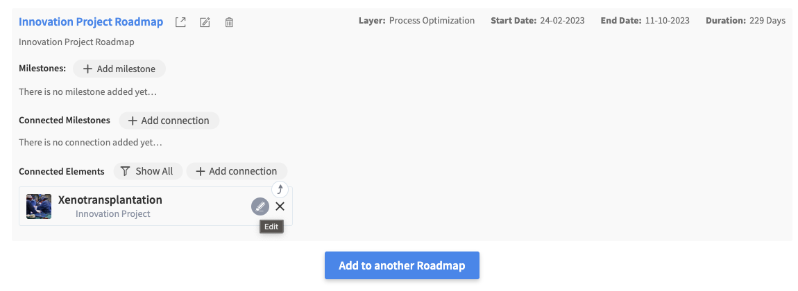 Whenever you add an element to the Roadmap, you can add information about Milestones and Connections.
