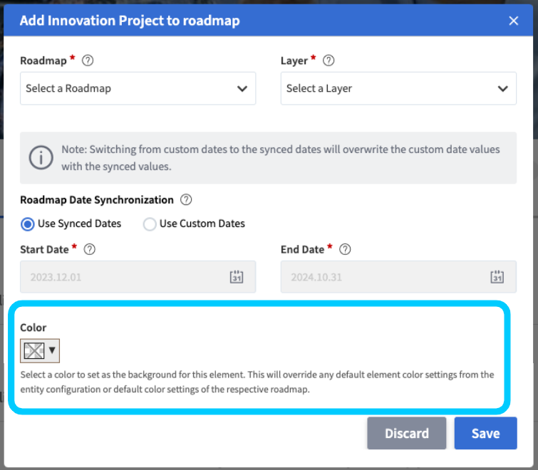 Within the Add/Edit element to roadmap option, the optional Color option is available. Via the Color option, you configure a color that will only apply to the particular roadmap record. This means that this color will only be reflected for this particular roadmap record of the element on the defined roadmap, while the color will not automatically be shown for the same element on other roadmaps.