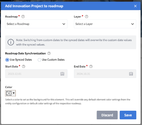 Click the Add to Roadmap button, and a pop-up will appear. Fill in the required information. Among the selection of the roadmap and the layer to add the roadmap record to, the user will be asked whether to Use Synced Dates or Custom Dates if the Synced Roadmap Dates feature is active. This means, the user must select whether the element shall have the same start and end date on this roadmap as on other roadmaps, or whether the element shall have a custom start and end date on this particular roadmap. Note that this selection is not to be made and simply Start and End Dates are to be added, if the Synced Roadmap Dates feature is not enabled.