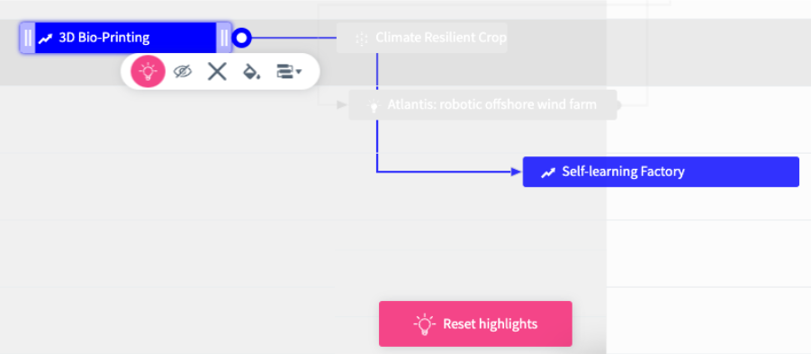 - Clicking on the option will highlight the element, as well as its directly connected elements and milestones.