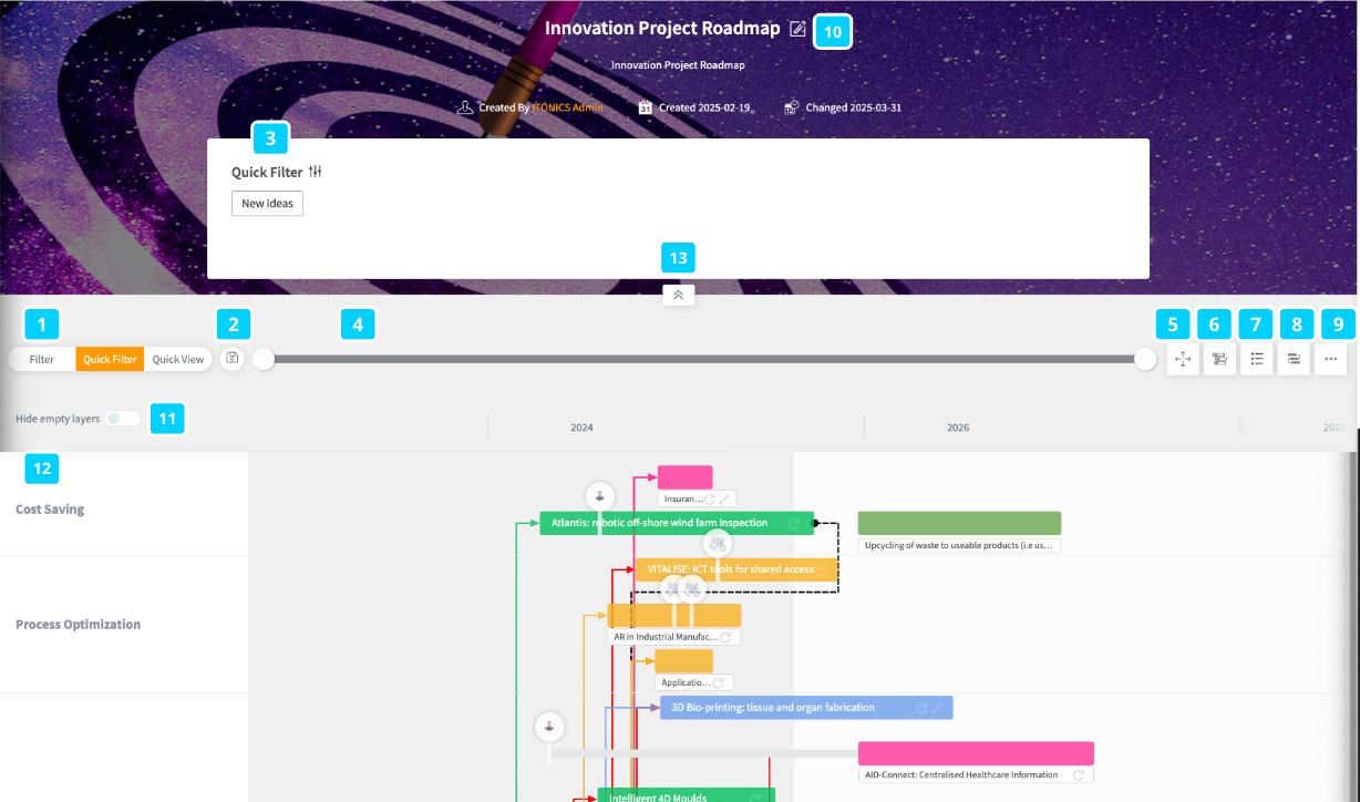 - Click the option to un-/pin the roadmap header to close/open the header to optionally make space for more elements to be displayed at once in the roadmap visualization. (13)