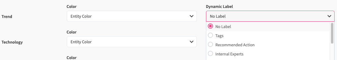 Now, within a roadmap session, similarly to the dynamic legends / configuration in other visualizations such as the Board, you can dynamically control the dynamic labels of the entity types on the particular roadmap from the roadmap legend (see screenshot below). Here, the dropdown fields that are also listed in the dynamic label configuration of the roadmap in its create/edit form are listed. Thus, the default dynamic label of a particular entity type, i.e. Trend Expert for the Trend entity type, might dynamically be changed from the respective dropdown in the roadmap legend, for example to change the dynamic label to show the Recommended Action for the Trend elements.