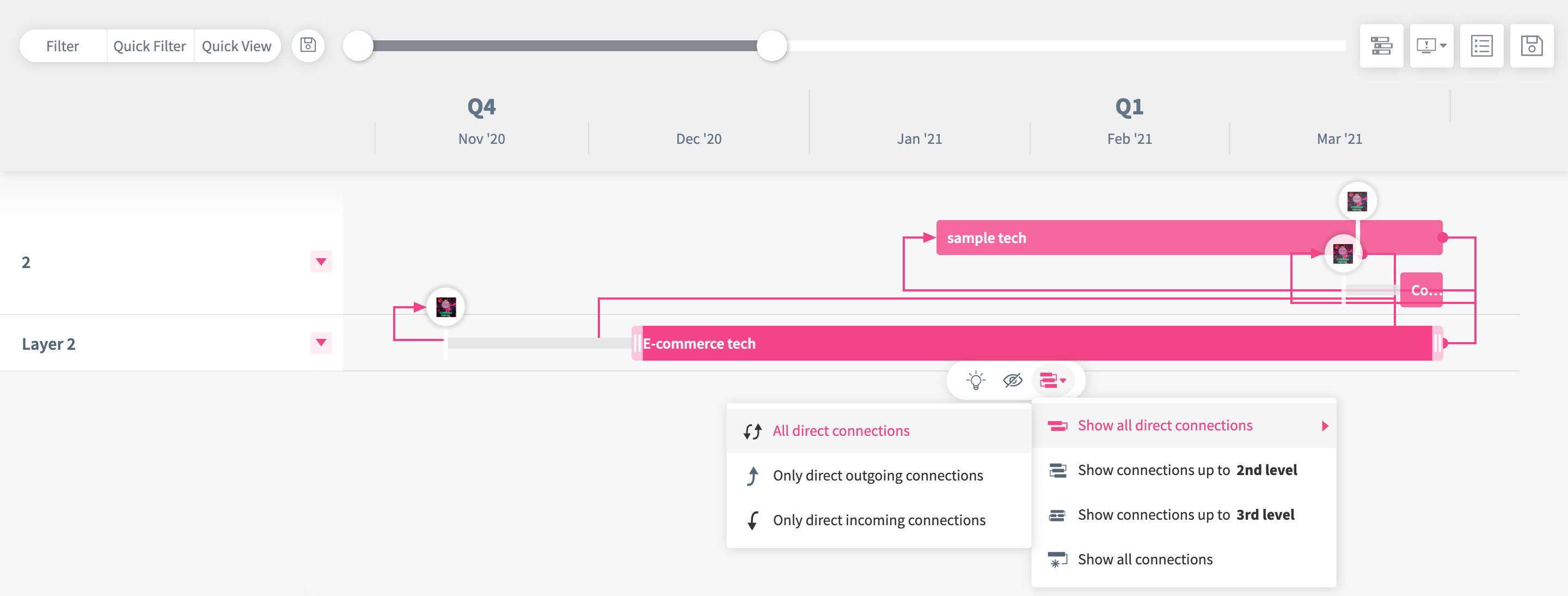 Roadmap Connection Types provide you with the option to utilize the connection type as a more useful information dimension on the roadmap.