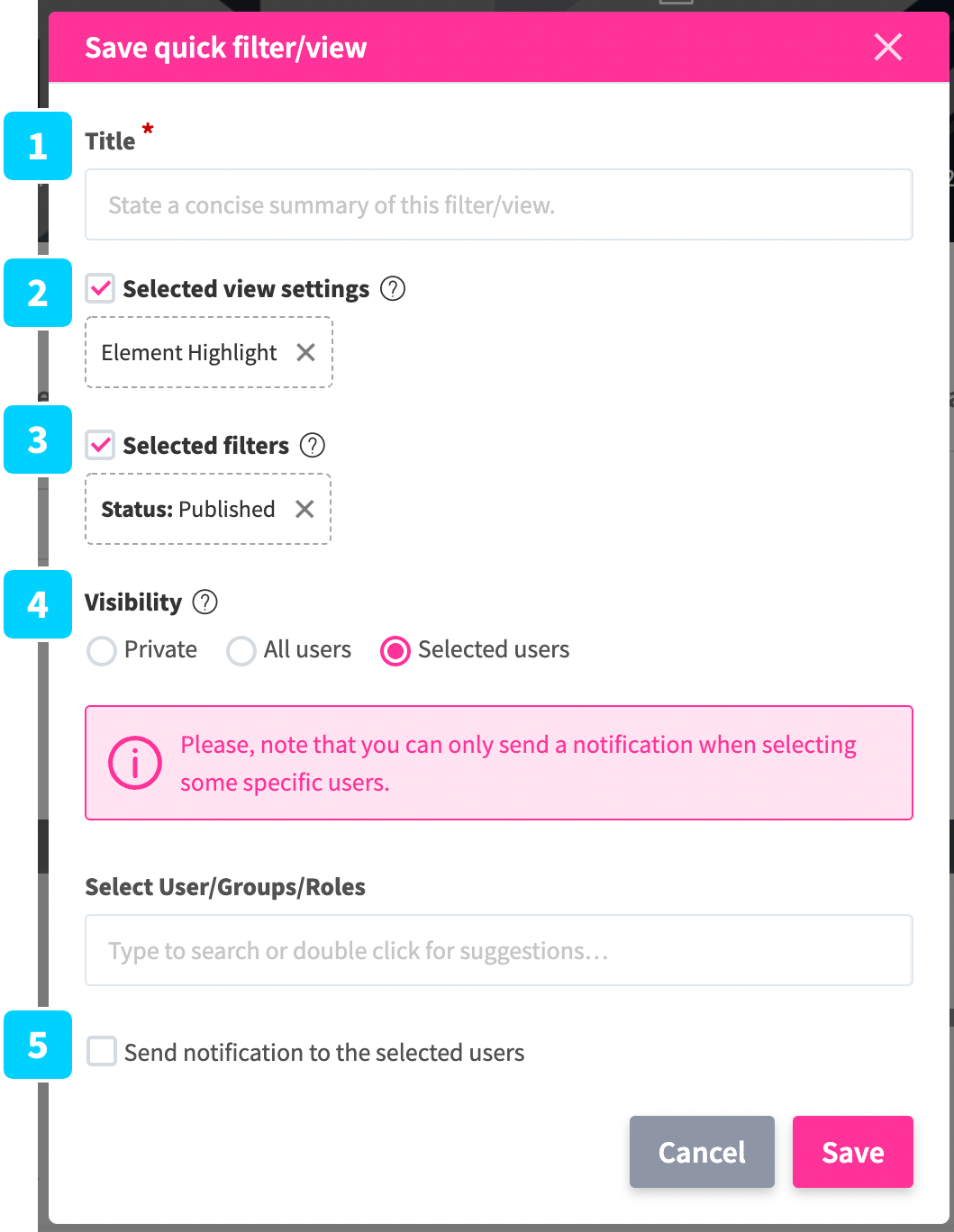 - “Selected users” will make it available to only the selected users, user groups, and user roles