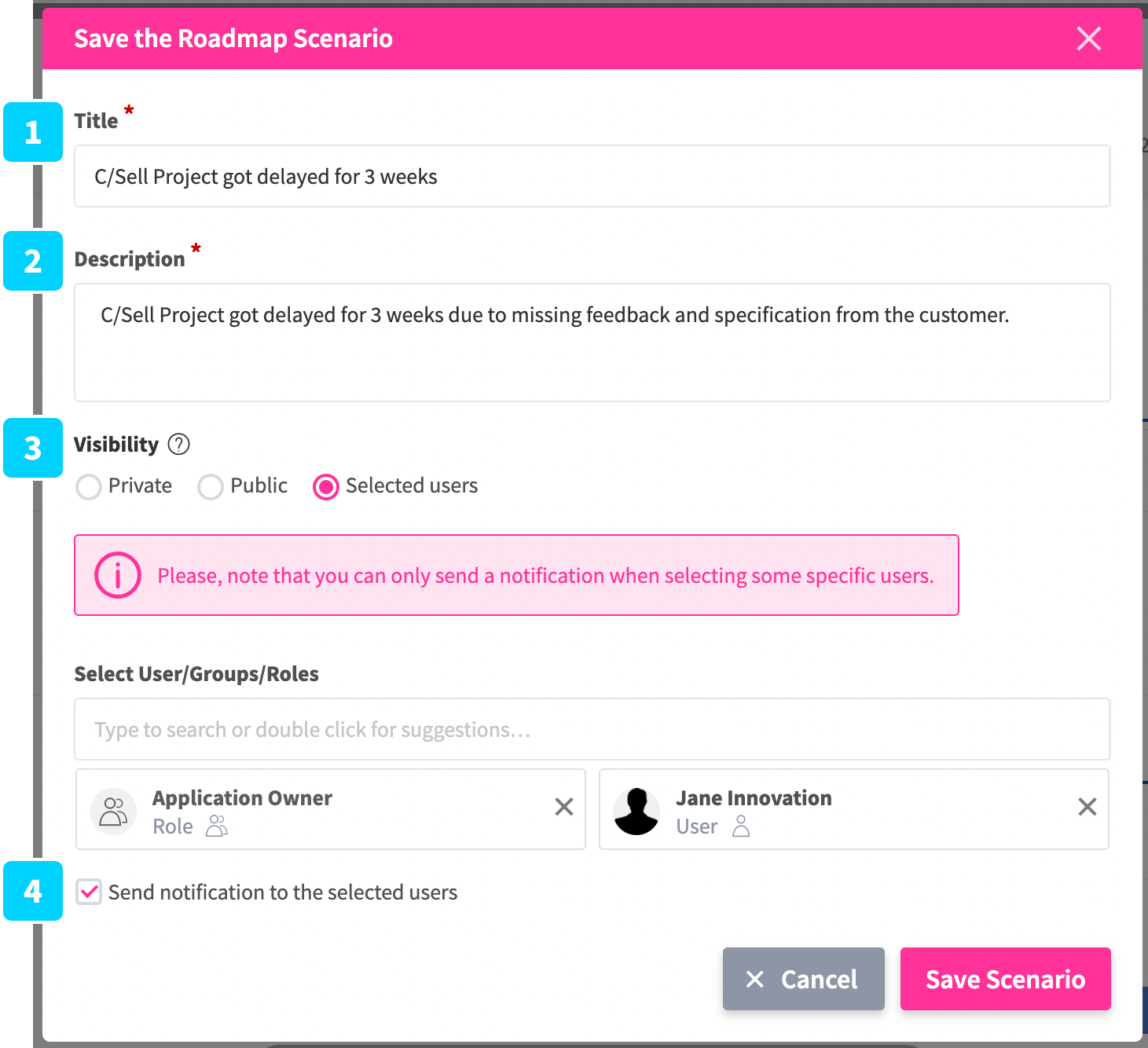 - “Private” will make it only accessible for the user that saved this roadmap scenario