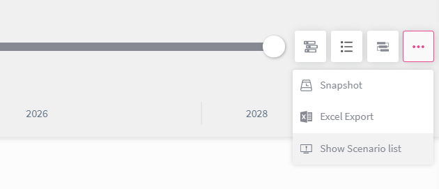 If you want to manage your roadmap scenarios, navigate to the top right corner of your roadmap (next to the timeline). From here, you can explore and update existing scenarios by navigating to the roadmap action “Show Scenario list” and clicking the Open up Scenario icon.