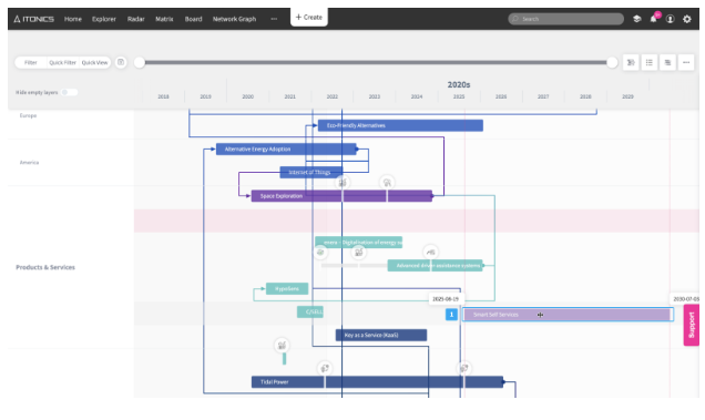 The ITONICS Roadmap helps you to both master strategic planning and generate an overview across the innovation landscape. This could include (a) future markets you identified to be attractive, (b) products and services you are working on to address that future (or existing) markets, (c) technologies you need to order to bring those products and services to market by developing them in-house or (d) working with start-ups, universities, and corporate partners.